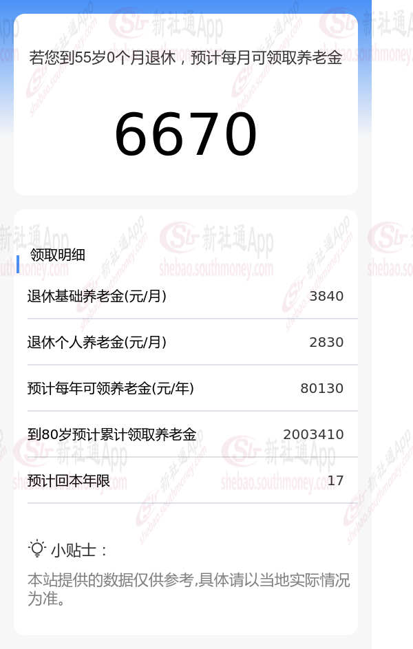 将基础养老金与个人养老金相加,我们得出每月可领取的养老金总额大约为6670元,即3840元(基础养老金)+ 2830元(个人养老金)。这个数字确定了退休后每月可以获得的稳定养老金收入。以上就是退休养老金的全部内容,如你对社保相关知识感兴趣,欢迎关注新社通APP解锁更多专业资讯!