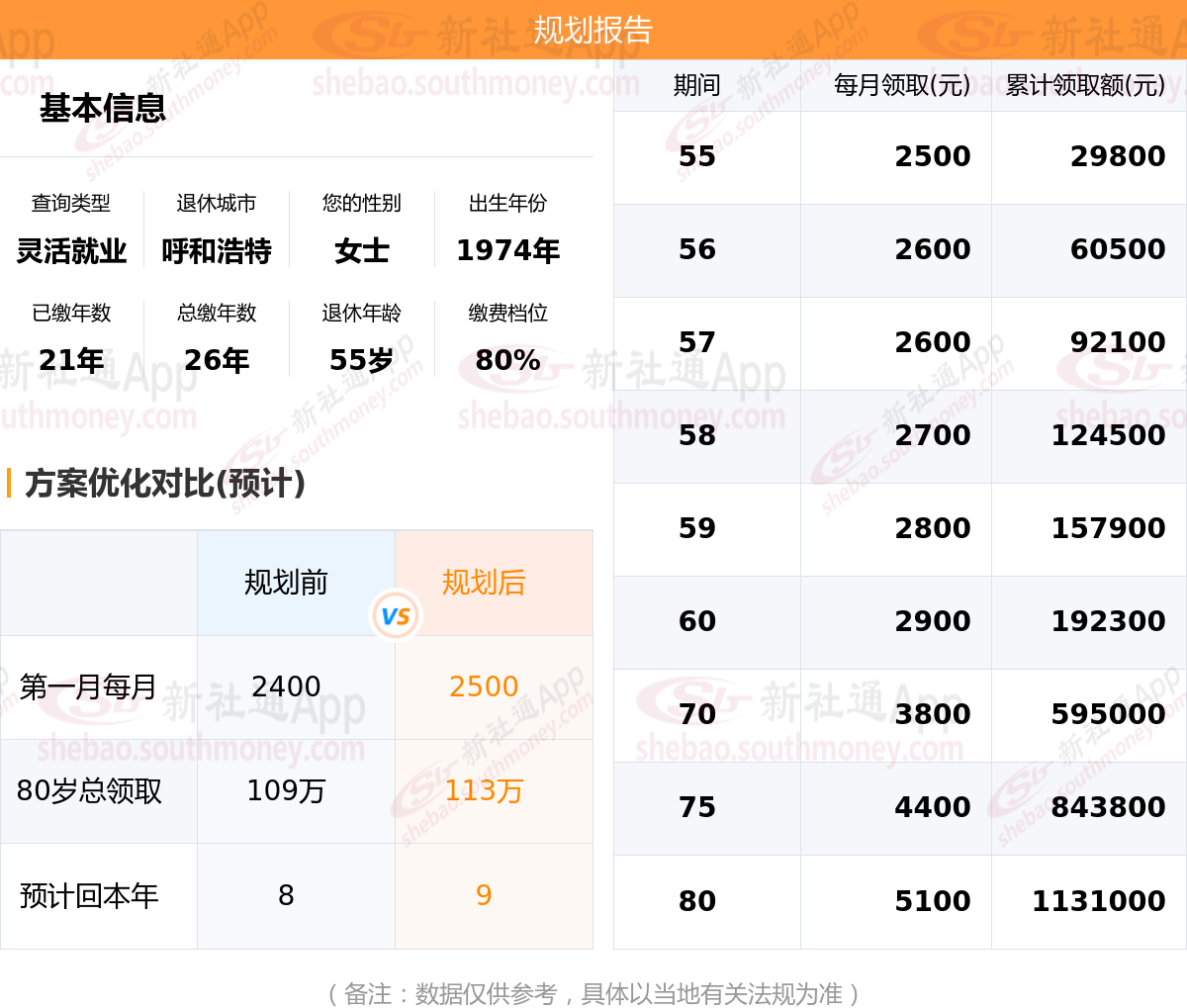 规划前:55岁约领2400元,新社通APP-养老金规划后:55岁约领2500元