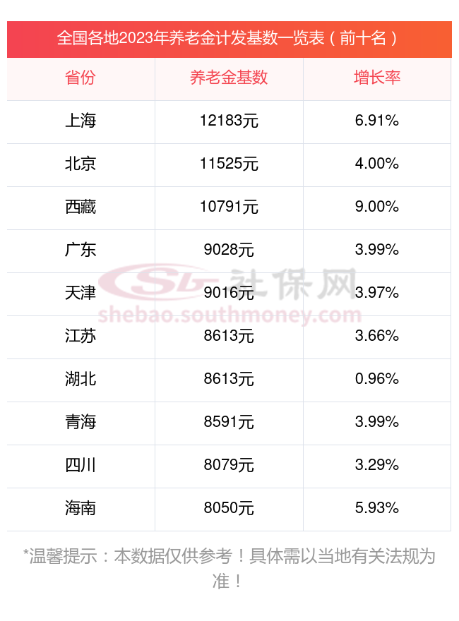 二、全国2023年养老金计发基数的前10省份的具体情况