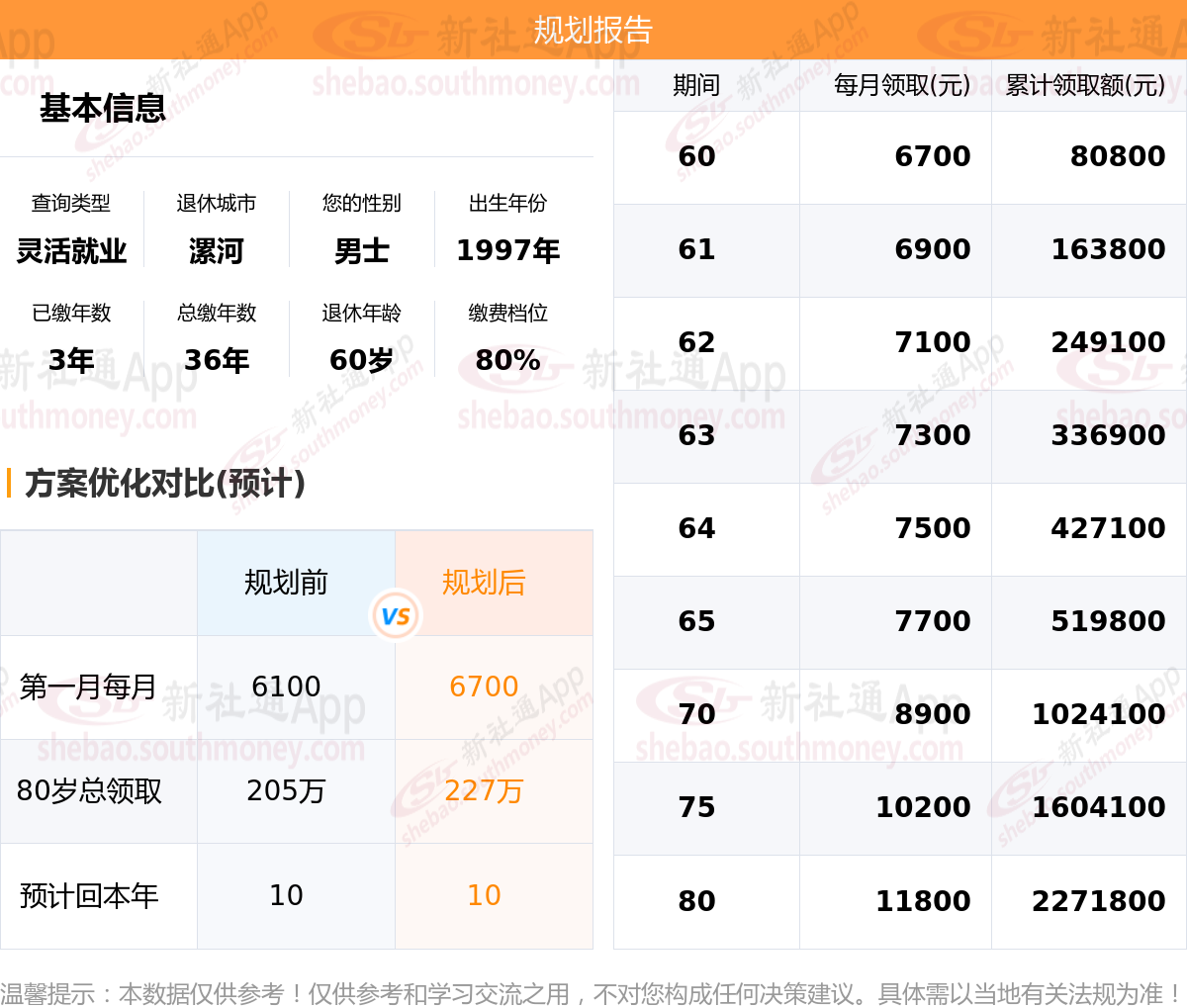 规划前:60岁退休后约领6100元,规划后:60岁退休后约领6700元