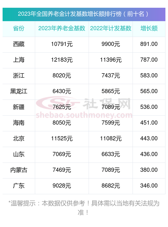 2023年最新养老金计发基数增长额排行榜前几位的情况如何呢?