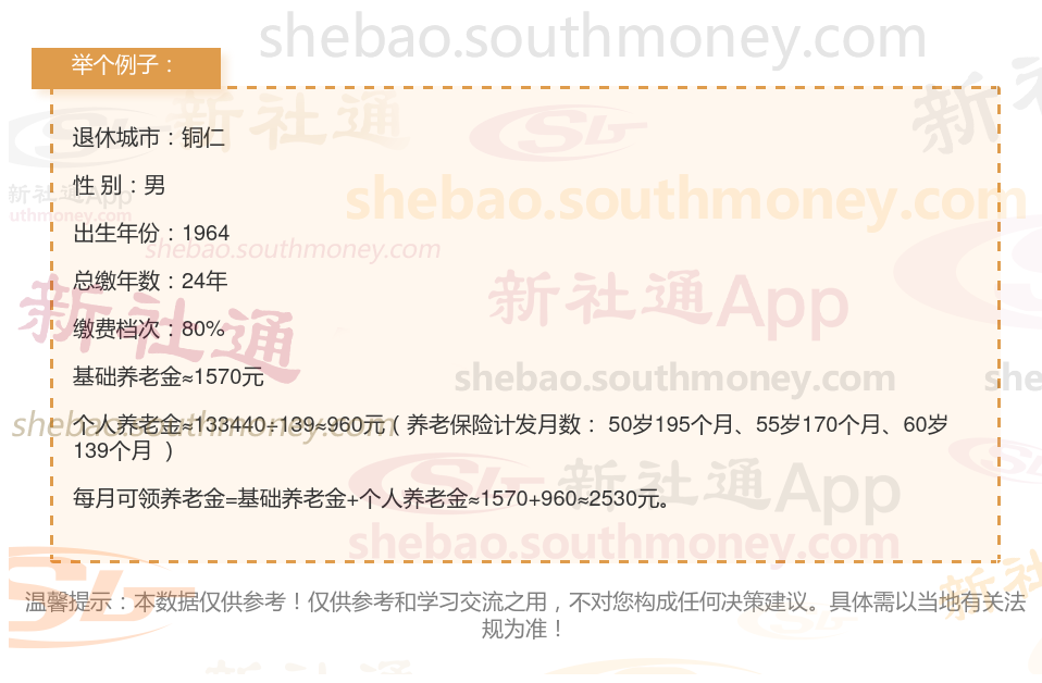 退休城市:铜仁,性别:男,出生年份:1964,总缴年数24年,缴费档次:80%,新社通app养老金计算器所得: