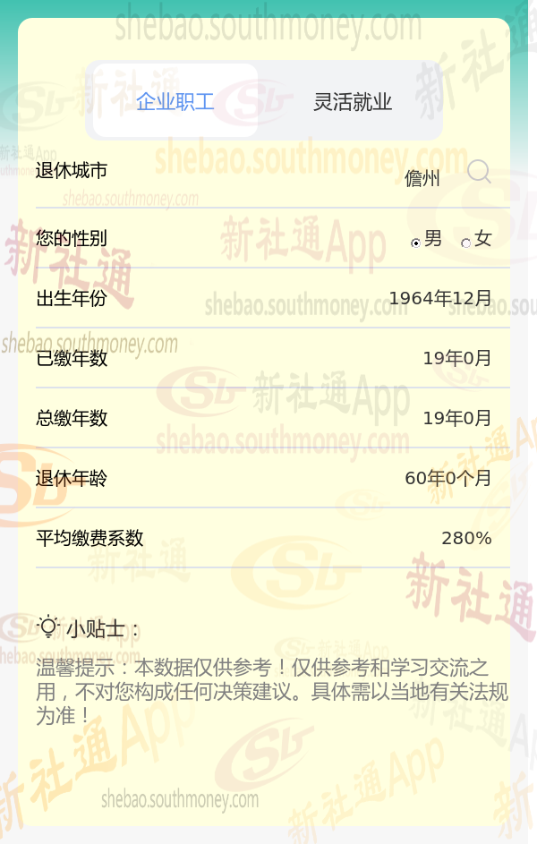 退休城市:儋州,性别:男,出生年份:1964,总缴年数19年,缴费档次:280%为例,新社通app养老金计算器预设工资增长率等参数为3%。在此情境下,其退休后能领取的养老金数额需通过计算器精确得出,但基于上述条件,预计数额会相对较低。为获准确估算,建议夏某使用计算工具按要求输入个人信息进行计算,具体数额依个人情况及当地法规而定。