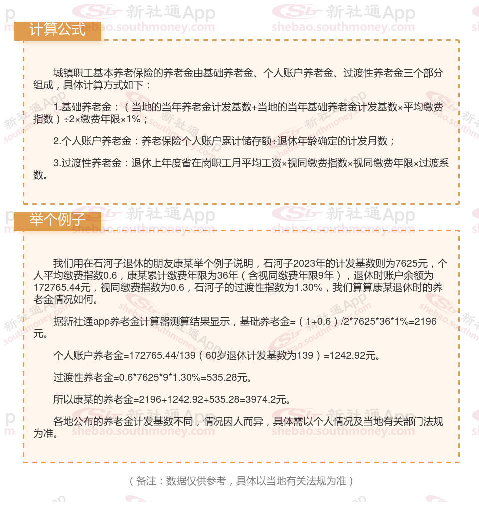 基本养老金由统筹养老金和个人账户养老金组成。基本养老金根据个人累计缴费年限、缴费工资、当地职工平均工资、个人账户金额、城镇人口平均预期寿命等因素确定。