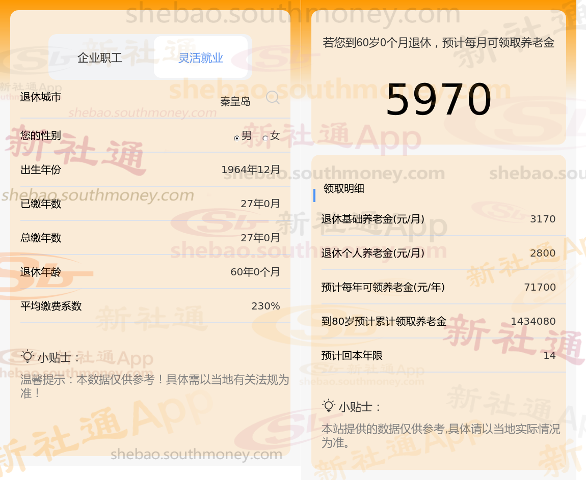 通过上面公式和社保网-APP根据新社通app-社保缴费查询工具提供的最新数据一起来了解下,秦皇岛退休养老金怎么算?