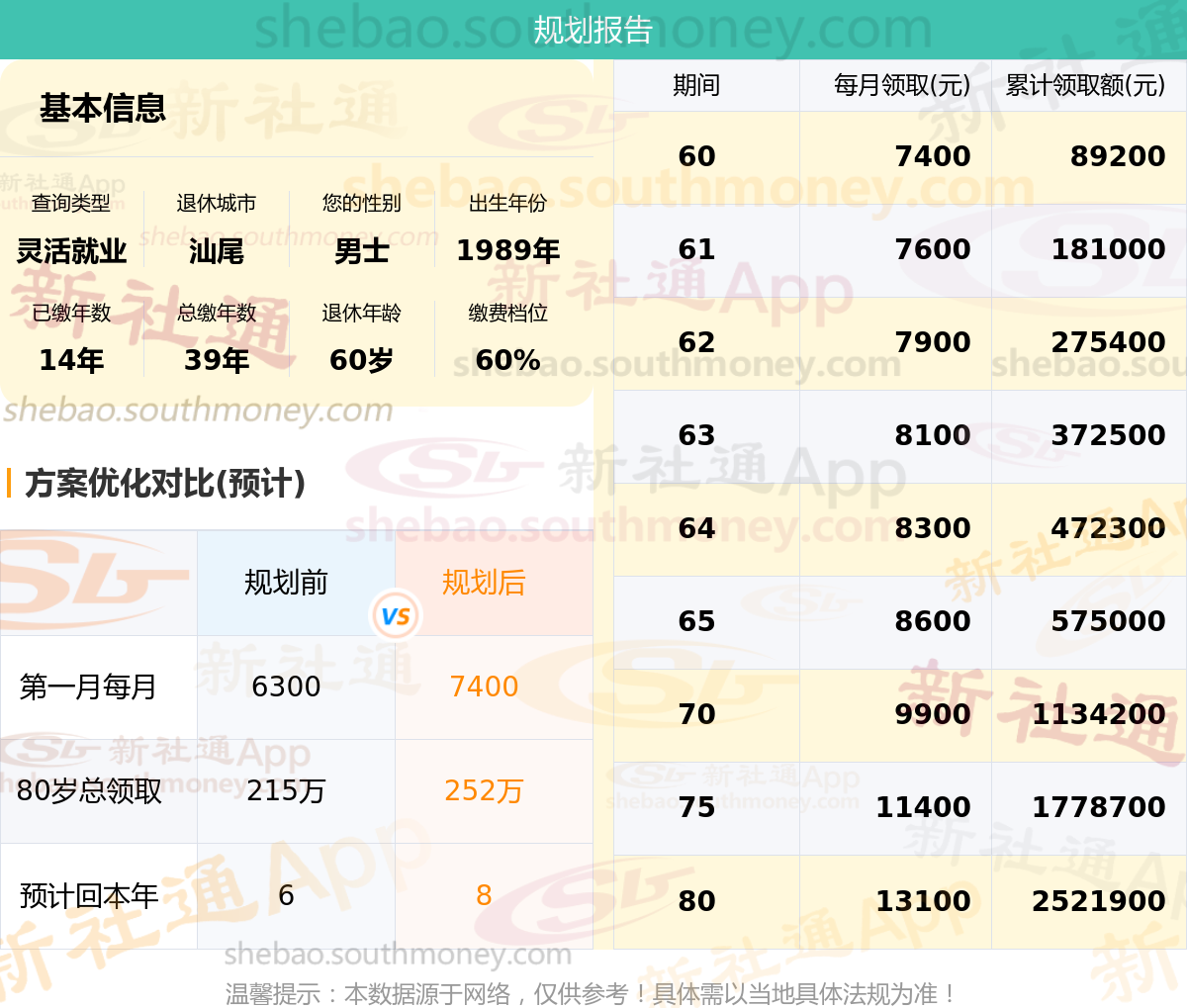 规划前:参保城市:广东汕尾,性别:男士,出生年月:1989,已缴年限:14年,总缴年数:39年,退休年龄:60岁,缴费档位:60%。