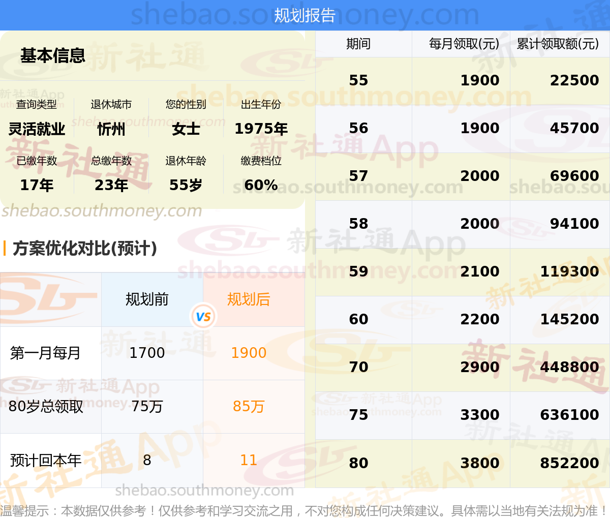 规划前:55岁第一个月约领1700元,新社通APP-养老金规划后:55岁第一个月约领1900元