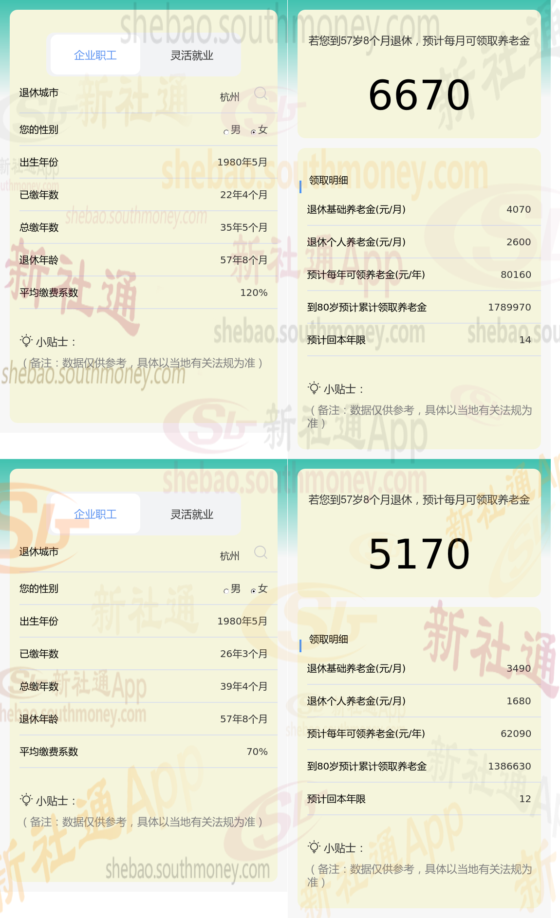 以杭州这座城市作为背景,社保君来对比两位退休人员的养老金情况: 第一位是夏某,他在杭州退休,社保缴费的年限达到了35年,于57周岁时退休,且他一直是按照120%的缴费档位进行缴纳的。 另一位是老韩,同样在杭州退休,但他的缴费年限稍长,为39年,也是在57周岁时退休。不过,与夏某,不同的是吕某是按照70%的比例来缴纳社保的。 (注:此讨论中,社保君暂不考虑过渡养老金。)