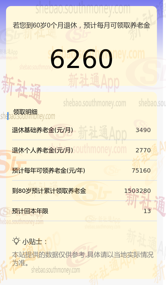 每月可领养老金总额:将基础养老金与个人养老金相加,每月可领取的养老金总额约为6260元(3490元+2770元)。