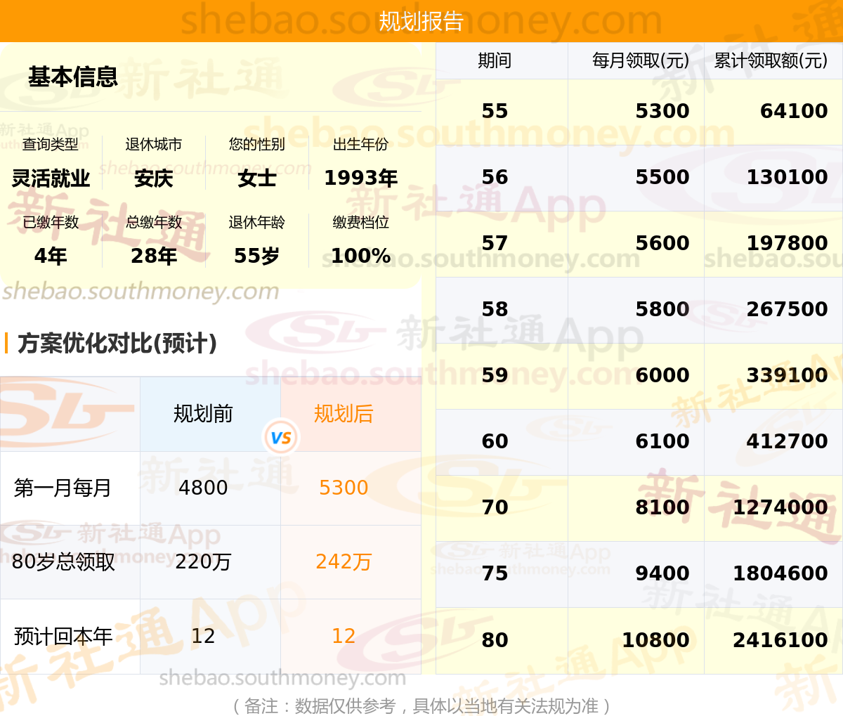 规划前:55岁第一个月约领4800元,新社通APP-养老金规划后:55岁第一个月约领5300元
