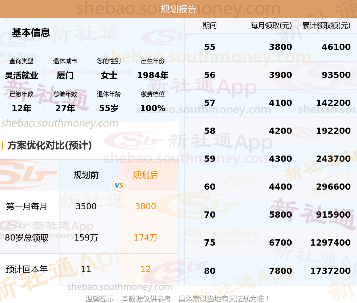 规划前:参保城市:福建厦门,性别:女士,出生年月:1984,已缴年限:12年,总缴年数:27年,退休年龄:55岁,缴费档位:100%。