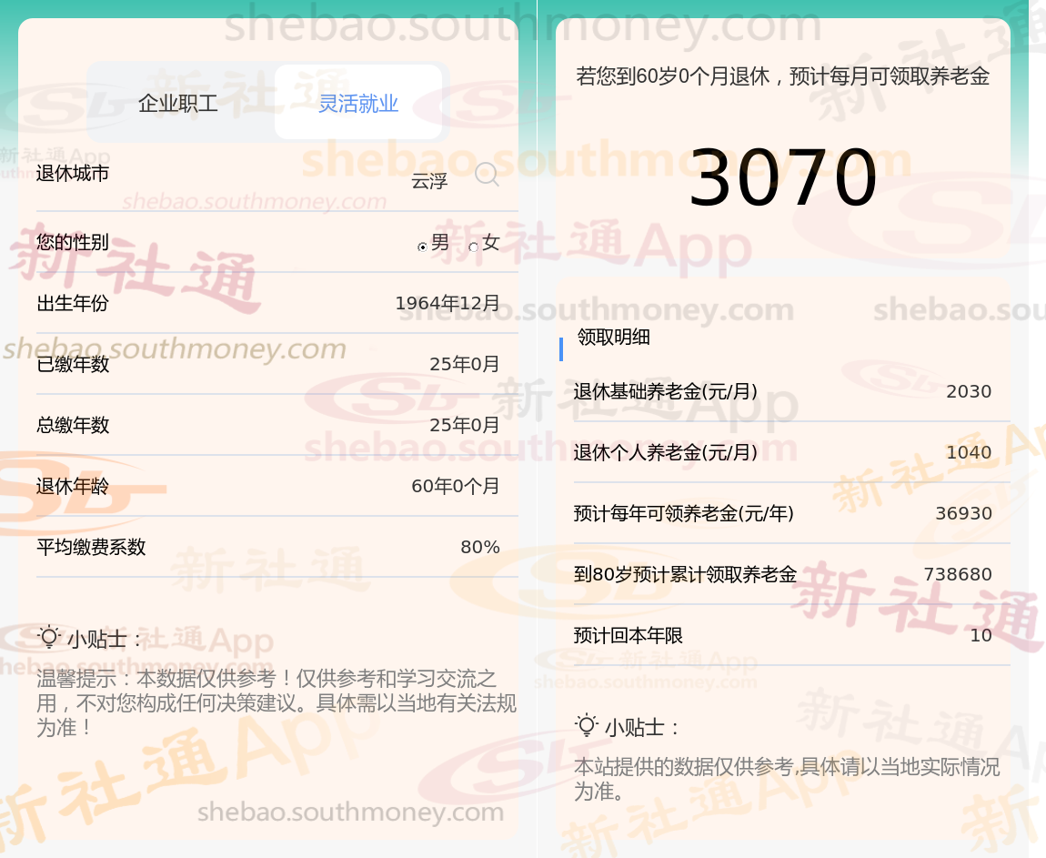 退休城市:云浮,性别:男,出生年份:1964,总缴年数25年,缴费档次:80%,新社通app养老金计算器所得: