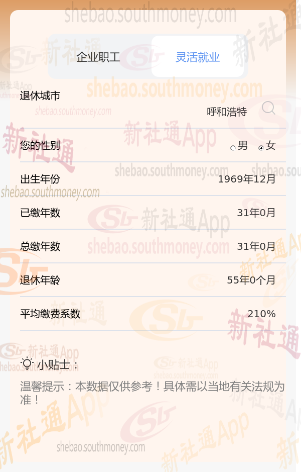 笔友柯某退休城市在呼和浩特,性别:女,出生年份:1969,缴费档次:210%为例,新社通app养老金计算器预设工资增长率等参数为3%。在此情境下,其退休后能领取的养老金数额需通过计算器精确得出,但基于上述条件,预计数额会相对较低。为获准确估算,建议柯某使用计算工具按要求输入个人信息进行计算,具体数额依个人情况及当地法规而定。