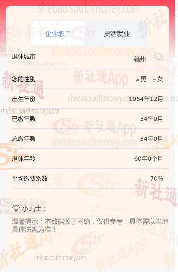 社保按70%档次缴费的康某,赣州城市退休,出生于1964年,工龄34年,男性。岁月流转,他终于迎来了自己的退休年龄。