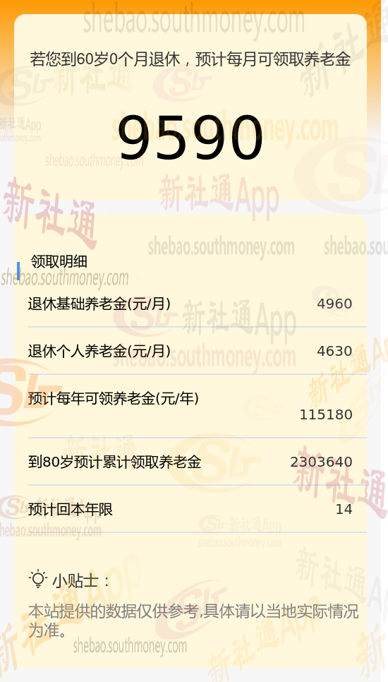 每月可领养老金总额:将基础养老金与个人养老金相加,每月可领取的养老金总额约为9590元(4960元+4630元)。