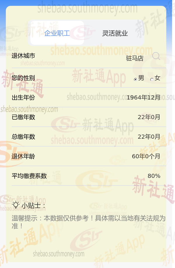 社保按80%档次缴费的朱某,驻马店城市退休,出生于1964年,工龄22年,男性。岁月流转,他终于迎来了自己的退休年龄。