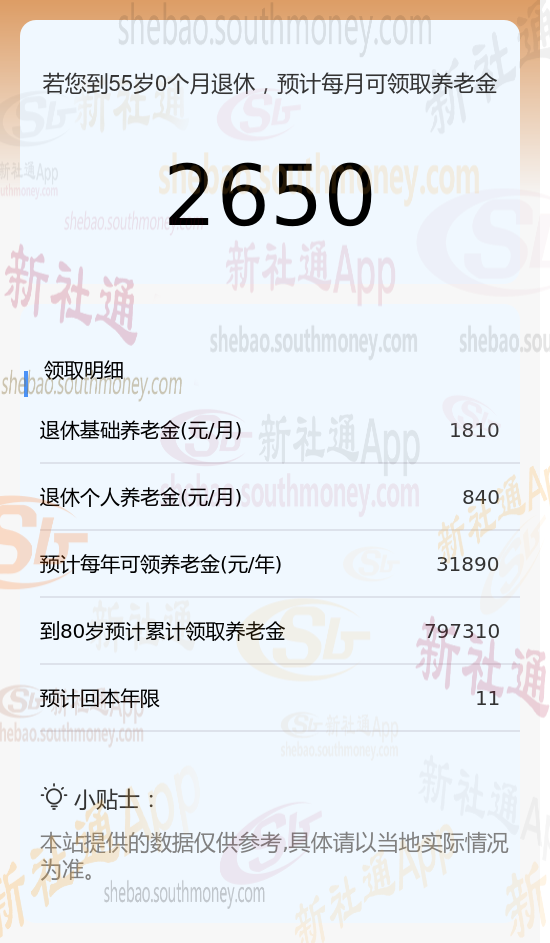 现在,我们来计算一下每月可领取的养老金总额。只需将基础养老金的1810元与个人养老金的840元相加,得到的总数就是每月可以领取的养老金,大约是2650元。这个数字象征着您退休后每月可以期待的一笔稳定收入。以上就是退休养老金的全部内容,如你对社保相关知识感兴趣,欢迎关注社保网解锁更多专业资讯!