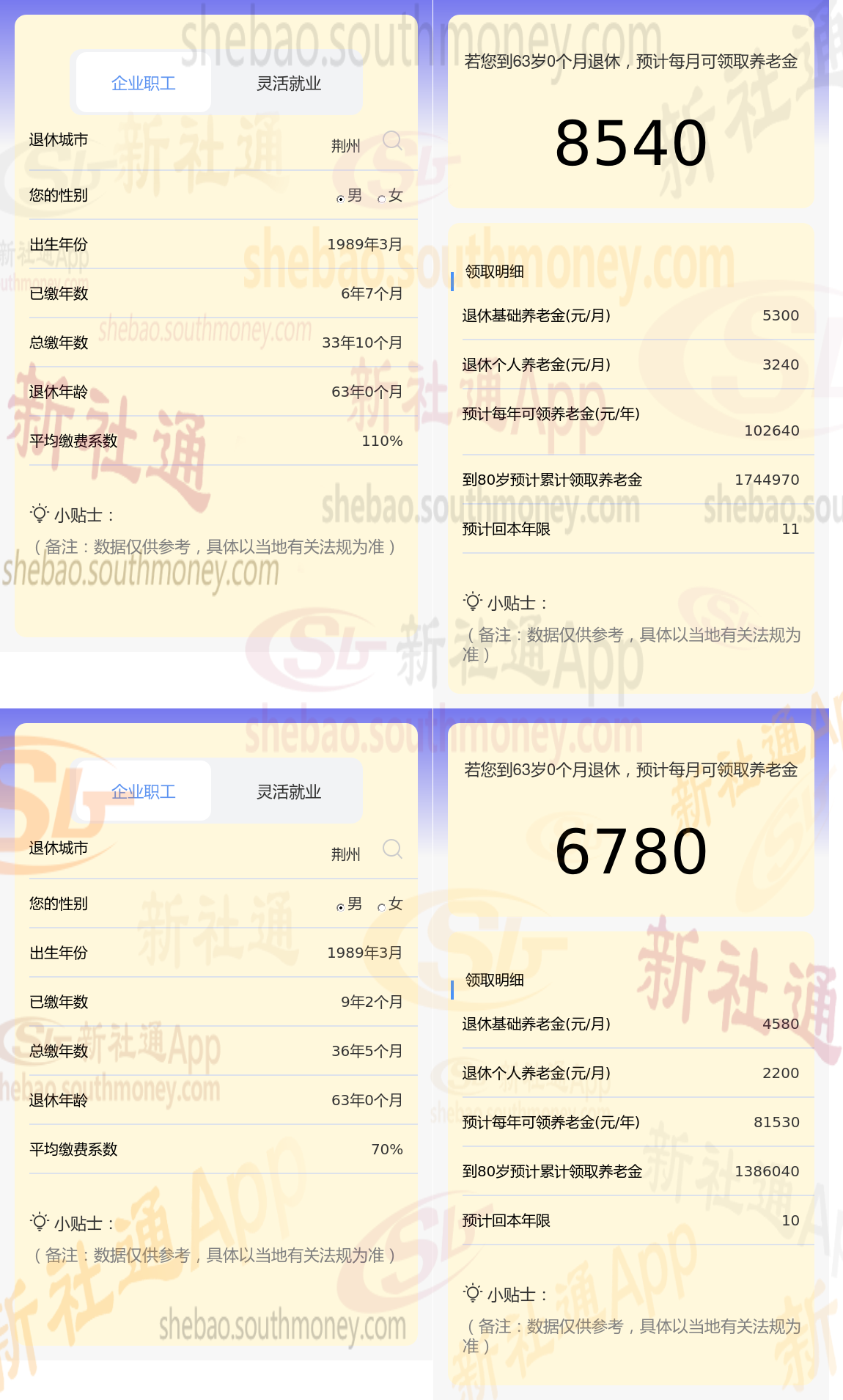 根据新社通app养老金计算器,轻松测算您的养老金!计算所得出:康某与老杜的差别,缴费年限、缴费档位不同的情况下,差别8540-6780=1760元。