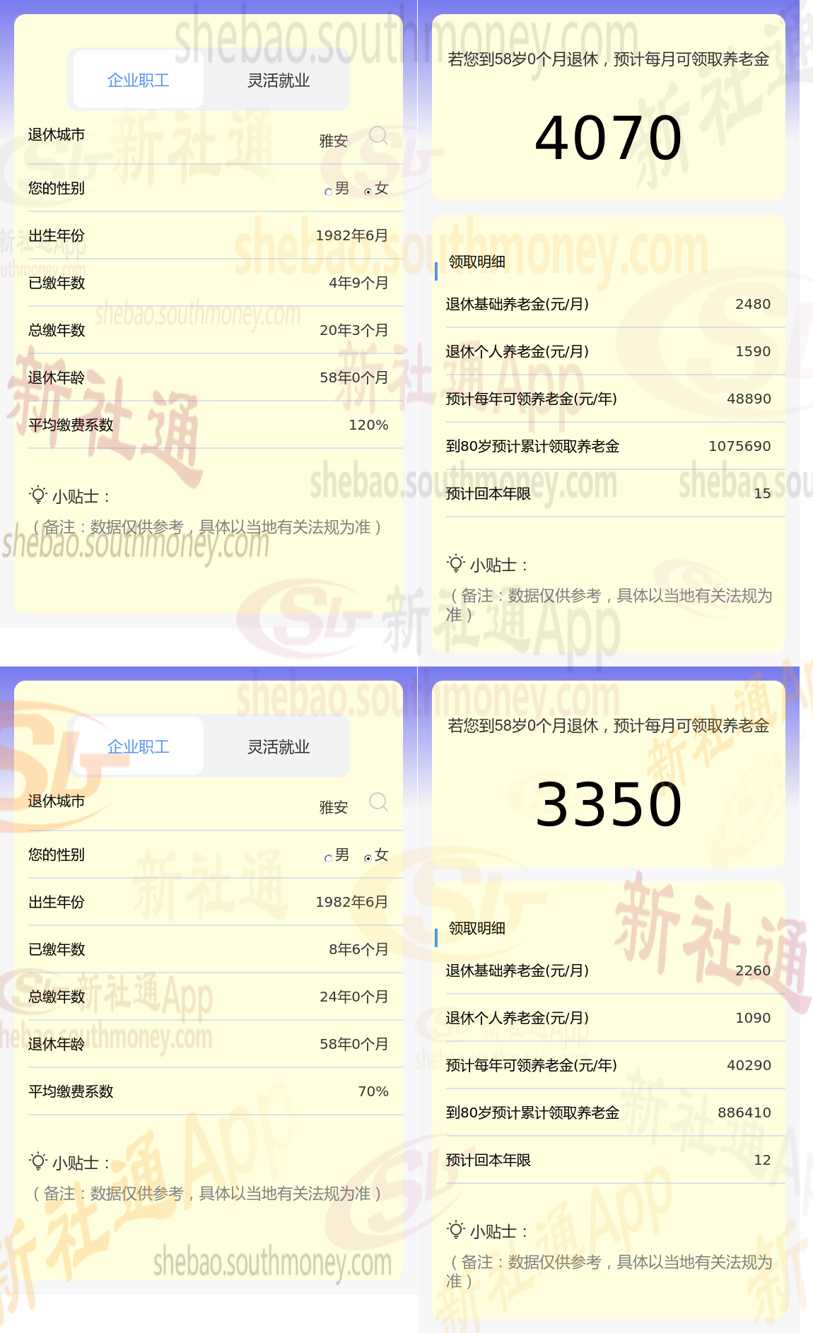 老赵:退休城市雅安,缴费年限24年,退休年龄58周岁,但是按70%缴纳社保。