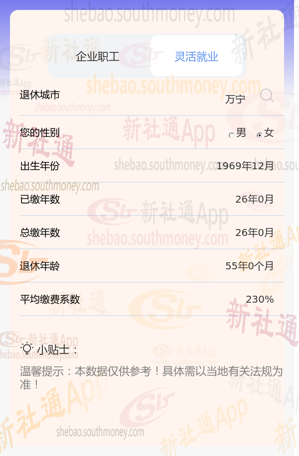 基础养老金:其计算公式为(全省上年度在岗职工月平均工资+本人指数化月平均缴费工资)÷2×缴费年限×1%。其中,本人指数化月平均缴费工资=全省上年度在岗职工月平均工资×本人平均缴费指数(本人平均缴费指数最高为300%,最低为60%,指数在0.6~3之间)。