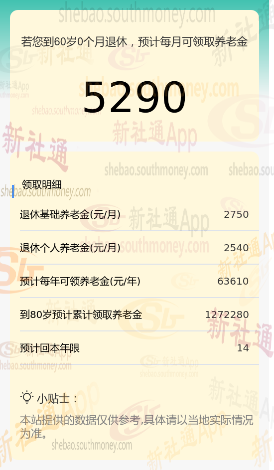 养老金总和:两者相加,每月养老金=2750元+2540元 ≈5290元/月。