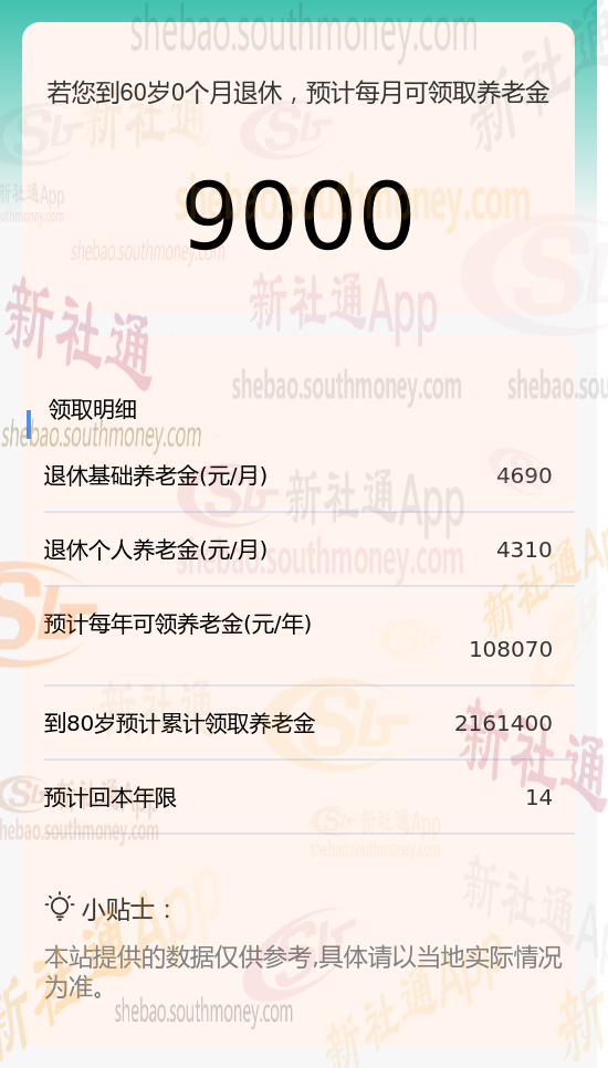 新社通app养老金计算器所得出,每月领取9000元养老金。