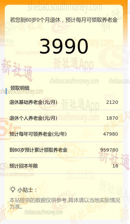 新社通app养老金计算器计算所得: