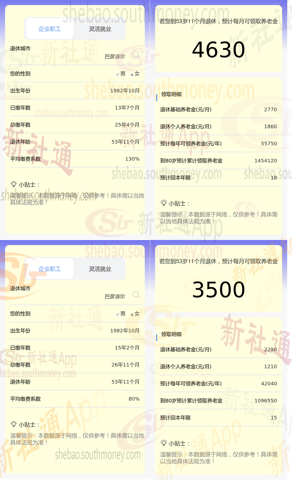 根据新社通app养老金计算器,轻松测算您的养老金!计算结果显示,沈某与老赵的养老金差距源于缴费年限和缴费档位的差异,这一差距具体体现在数额上,沈某的4870元减去老赵的3690元,等于1180元。