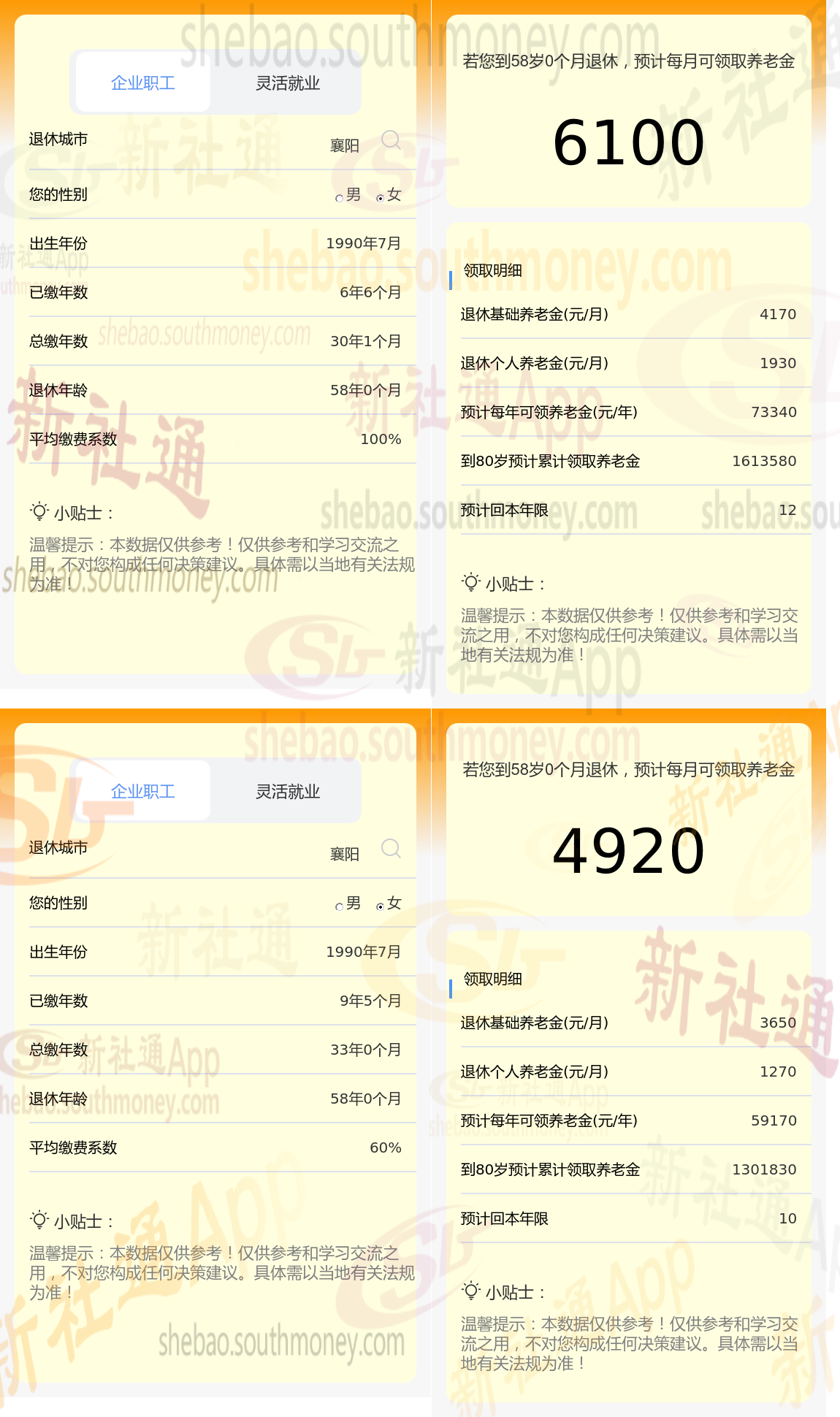 根据新社通app养老金计算器,轻松测算您的养老金!计算所得出:张某与老方的差别,缴费年限、缴费档位不同的情况下,差别6100-4920=1180元。
