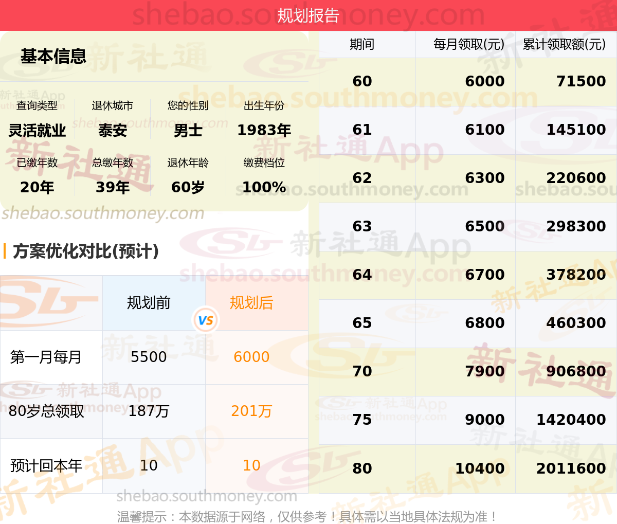 规划前:60岁第一个月约领5500元,新社通APP-养老金规划后:60岁第一个月约领6000元