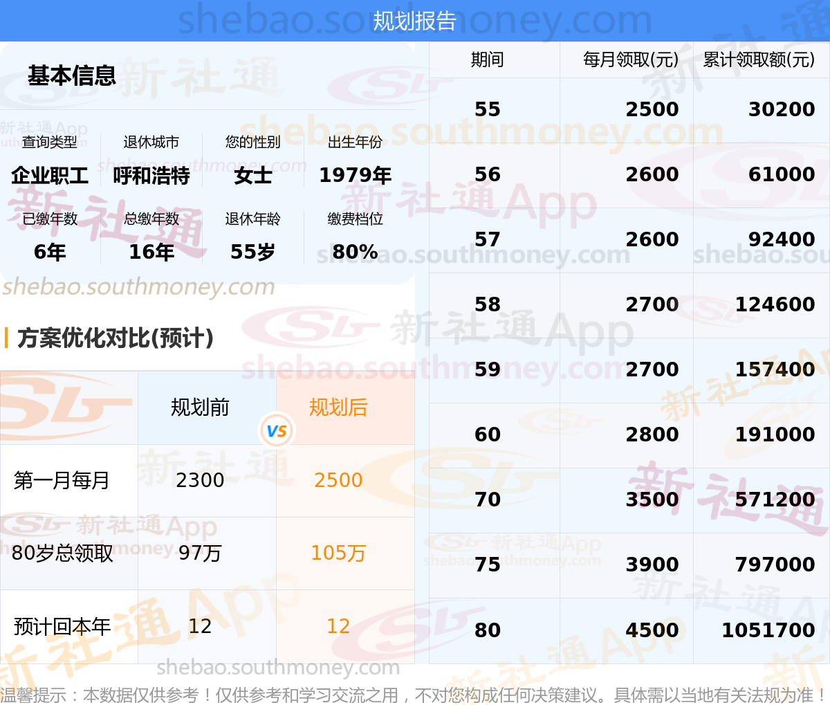 规划前:参保城市:内蒙古呼和浩特,性别:女士,出生年月:1979,已缴年限:6年,总缴年数:16年,退休年龄:55岁,缴费档位:80%。