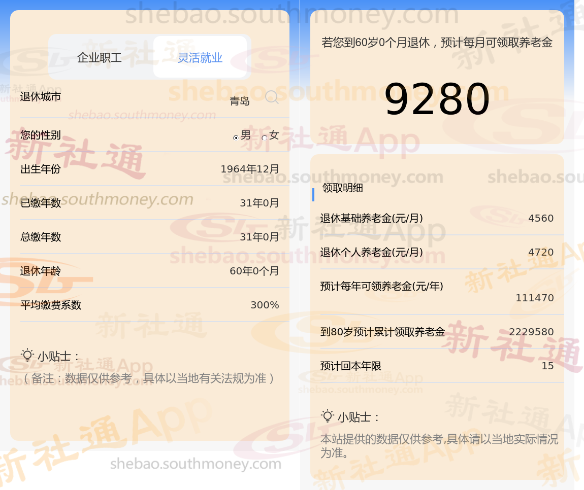 个人档案:男性,1964年出生,青岛退休职工,社保缴费31载,档次300%。