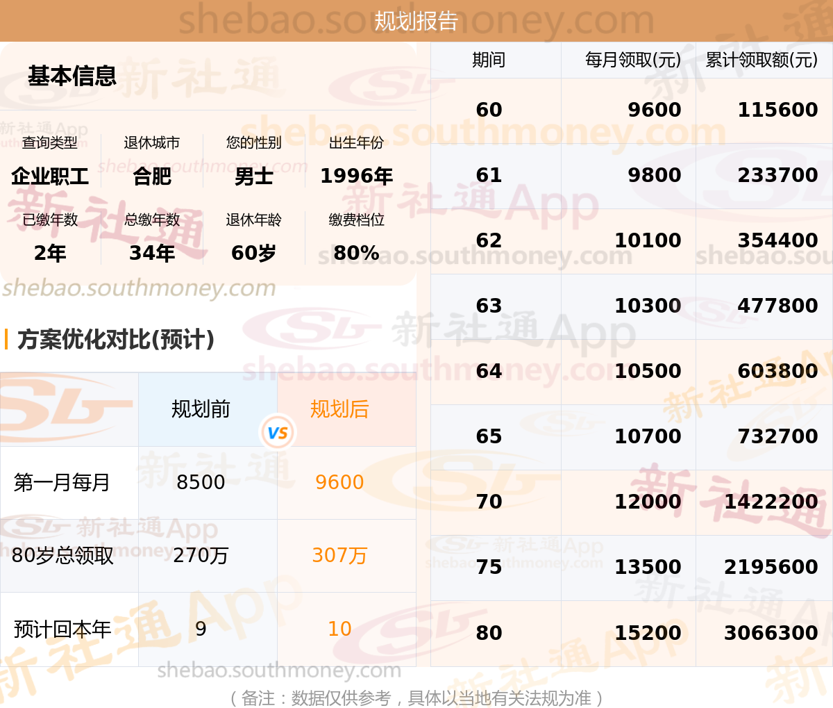 规划前:60岁第一个月约领8500元,新社通APP-养老金规划后:60岁第一个月约领9600元