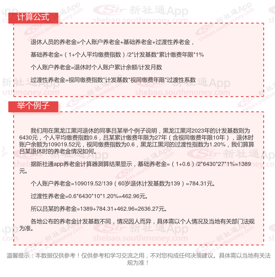 为了更加精确地了解自己未来每月能够领取的养老金金额,我们需要深入了解并掌握养老金的计算方法通过了解养老金的计算方式和影响因素,我们可以更好地规划自己的退休生活,确保生活质量不会因为退休而大幅下降。那么,社保交退休,每月能领取多少钱的养老金?下面随新社通app小编一起来看看黑龙江黑河2024年养老金计算公式。