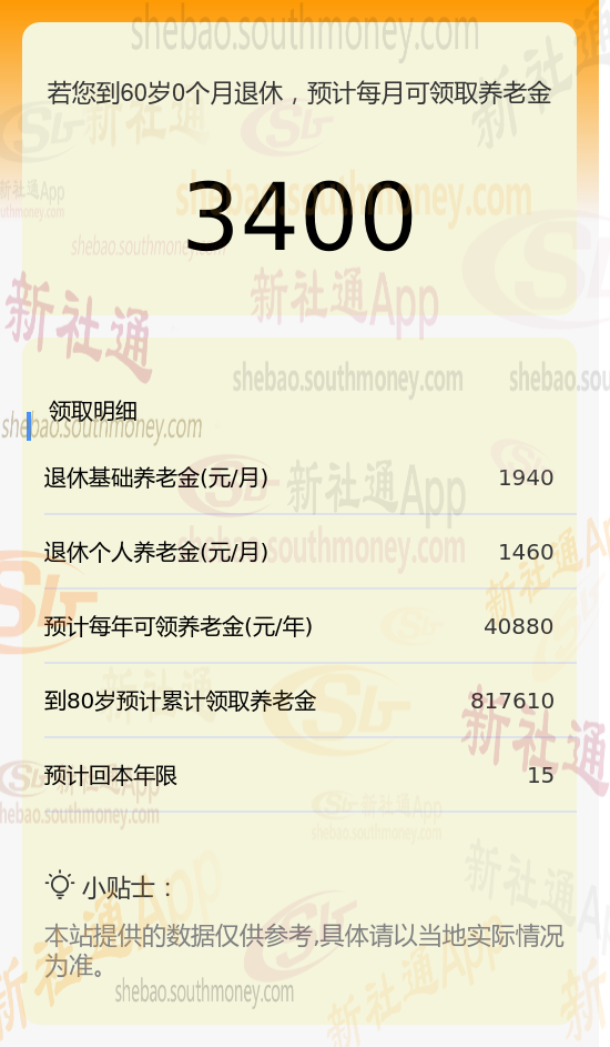 新社通app养老金计算器计算所得: