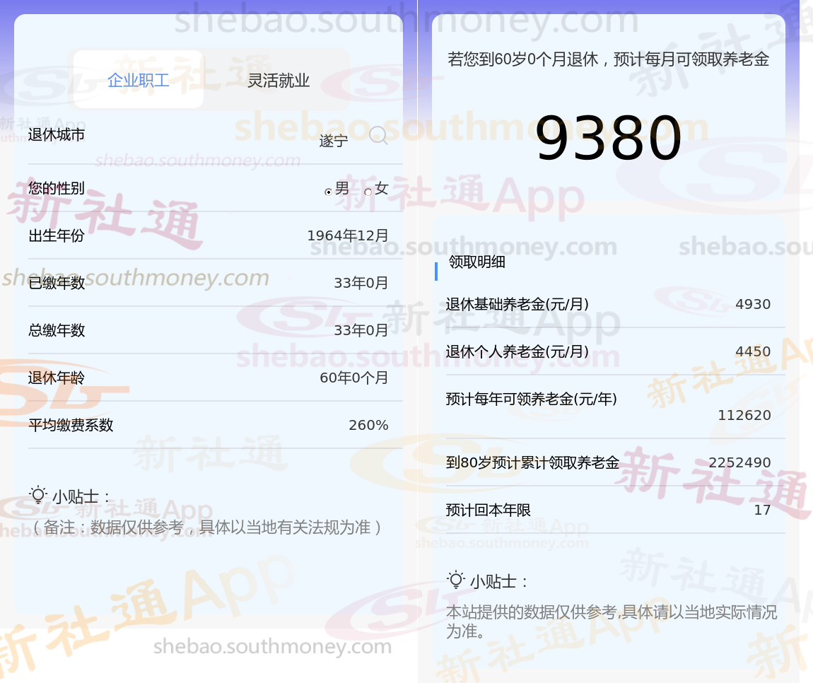 张某,作为一位有着33年缴费年限的退休者,其缴费档次一直保持在较高的260%水平。基于这些条件,我们使用了新社通app养老金计算器来为他做一个大致的估算:
