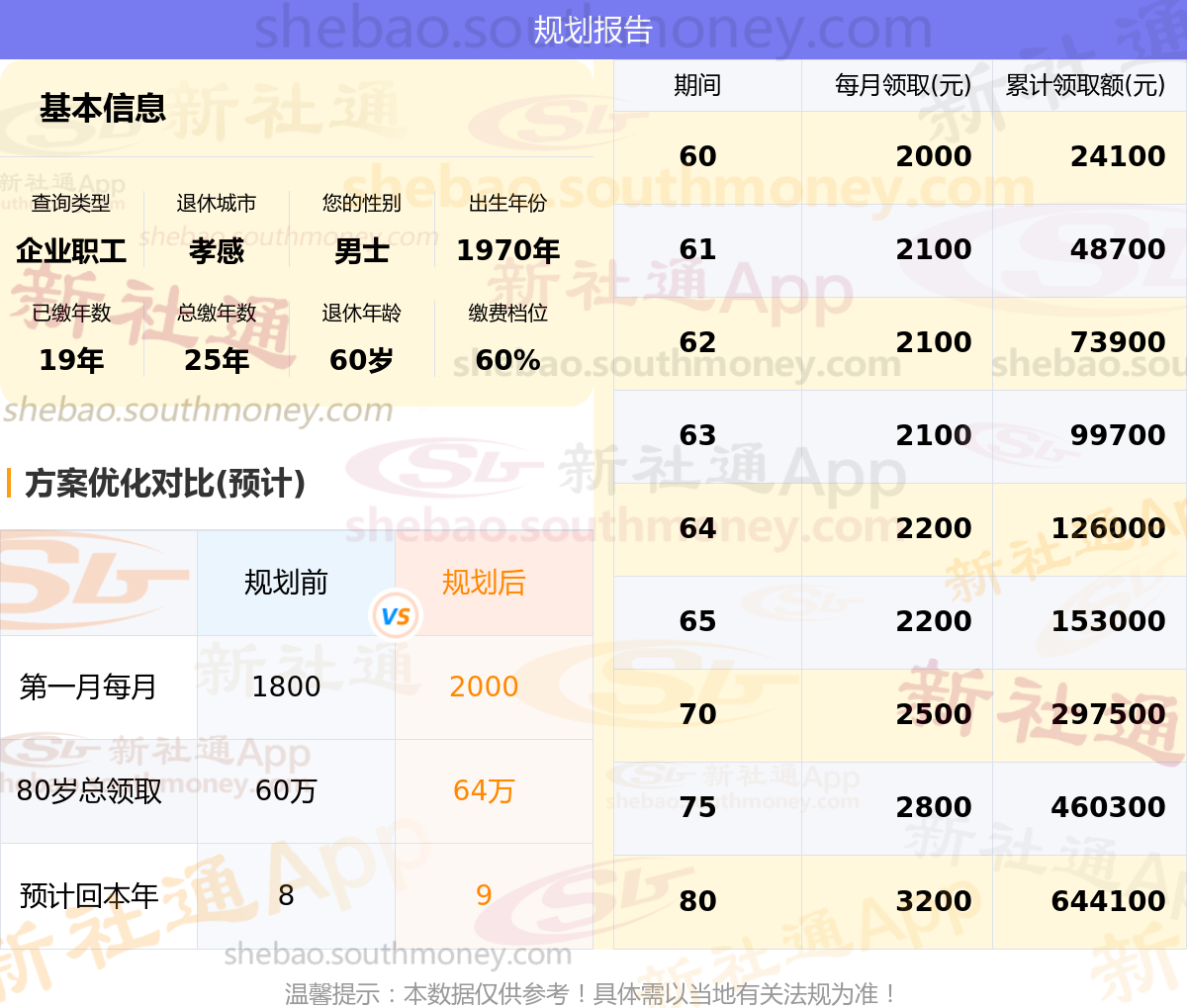 规划前:参保城市:湖北孝感,性别:男士,出生年月:1970,已缴年限:19年,总缴年数:25年,退休年龄:60岁,缴费档位:60%。