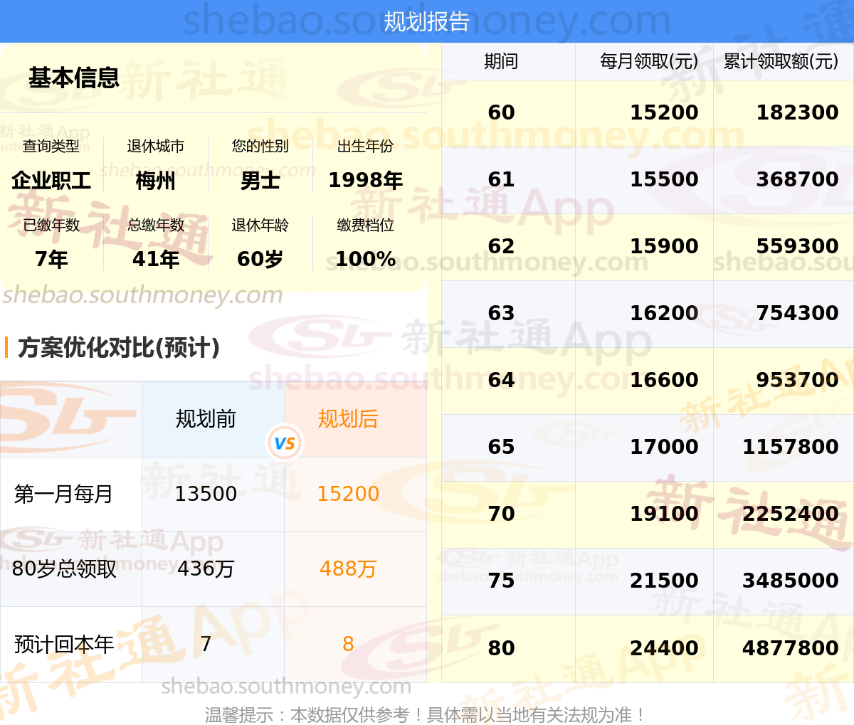 规划前:60岁退休后约领13500元,规划后:60岁退休后约领15200元