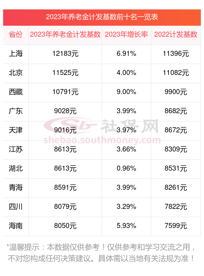下面已经公布2023年养老金计发基数的前10省份的具体情况