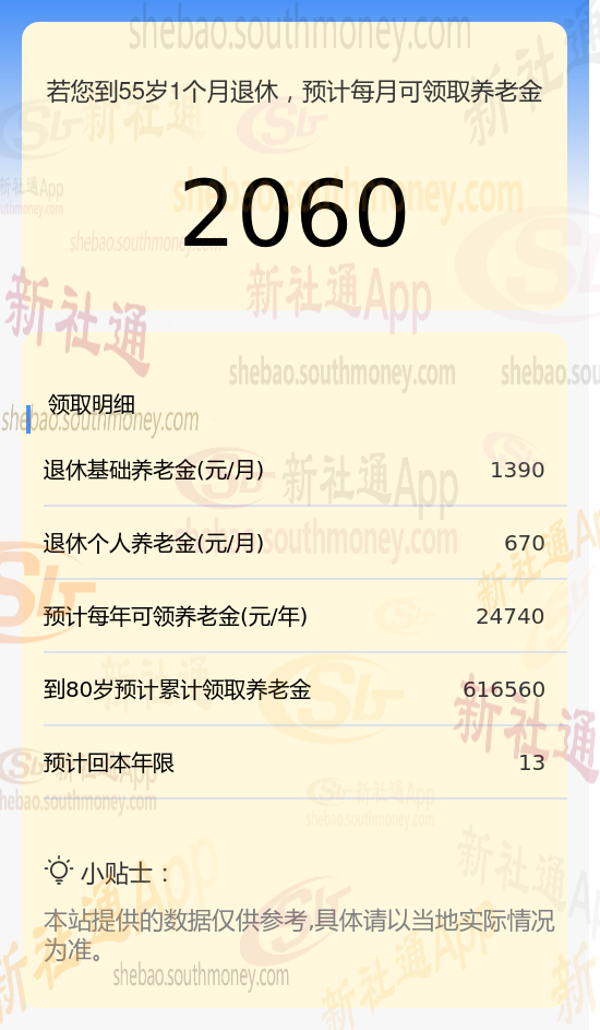 每月可领养老金=基础养老金+个人养老金≈1390+670≈2060元。
