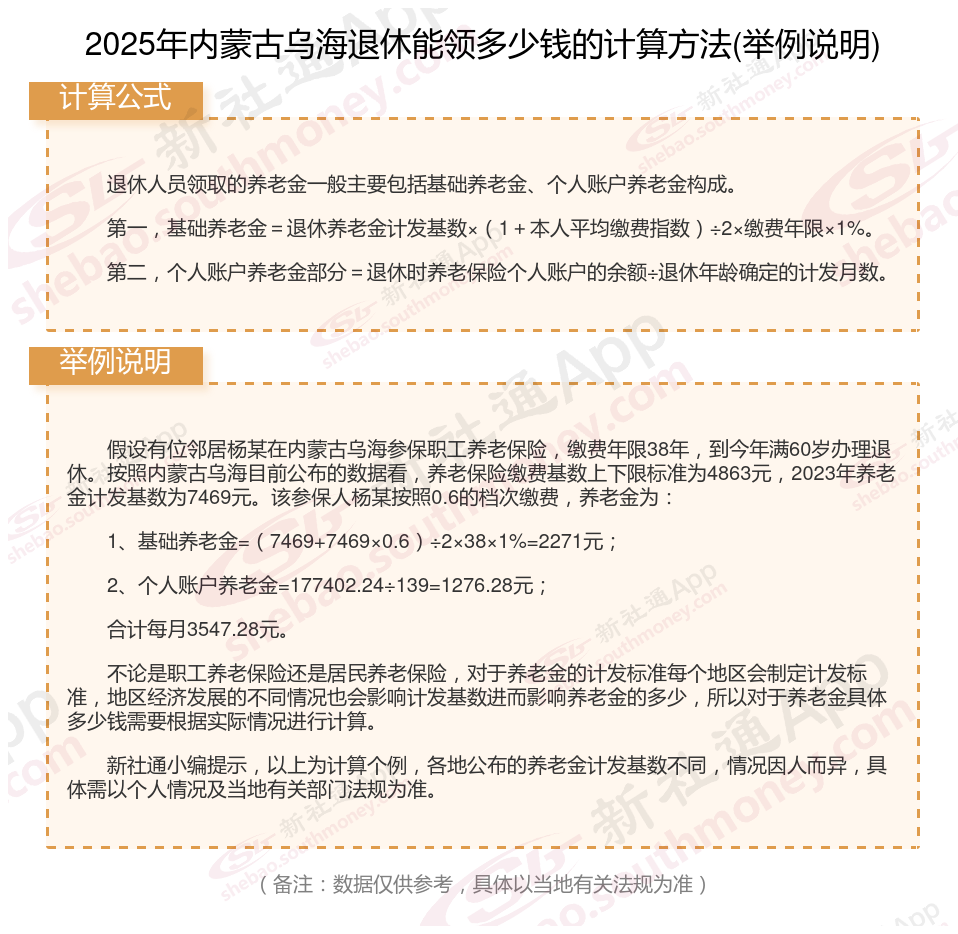 2025内蒙古乌海退休工资多少钱一个月?据新社通app获悉,养老金无疑是大众瞩目的焦点,特别是对于那些即将或已经步入退休生活的人们而言,其数额的多少直接关系到他们日常生活的舒适程度。随着我国养老保险体系的逐步深化与改进,养老金的计算方式也在不断地更新调整。退休时间、缴费年限以及缴费基数的差异,均会对最终养老金的数额产生显著影响。因此,了解并适应这些变化,对于确保个人退休后的生活质量至关重要。下面随新社通app小编一起来了解内蒙古乌海社保退休工资2025计算方法及内蒙古乌海养老保险要交多少钱吧!