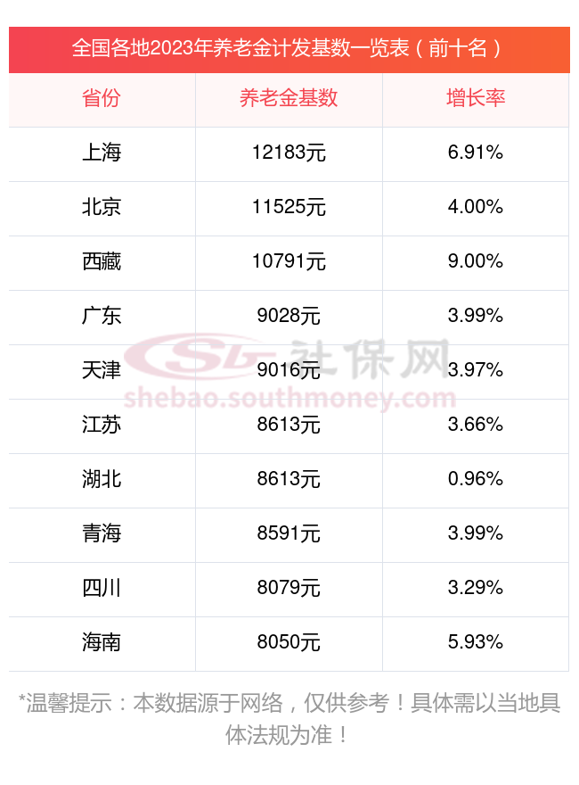 据了解,全国各省均呈上涨趋势。以下是2023年全国31省的养老金计发基数前十名