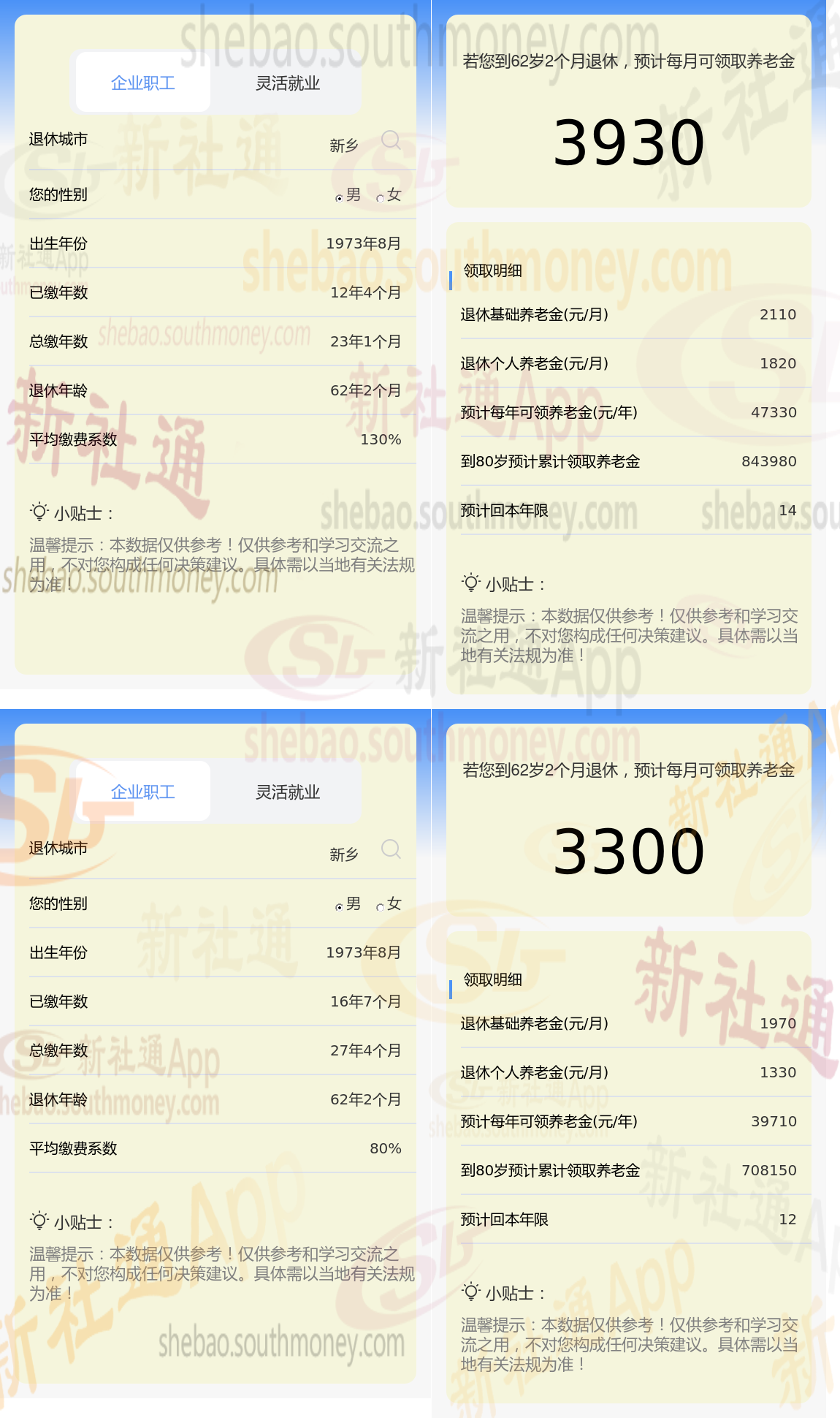 根据新社通app养老金计算器,轻松测算您的养老金!计算所得出:沈某与老何的差别,缴费年限、缴费档位不同的情况下,差别3930-3300=630元。