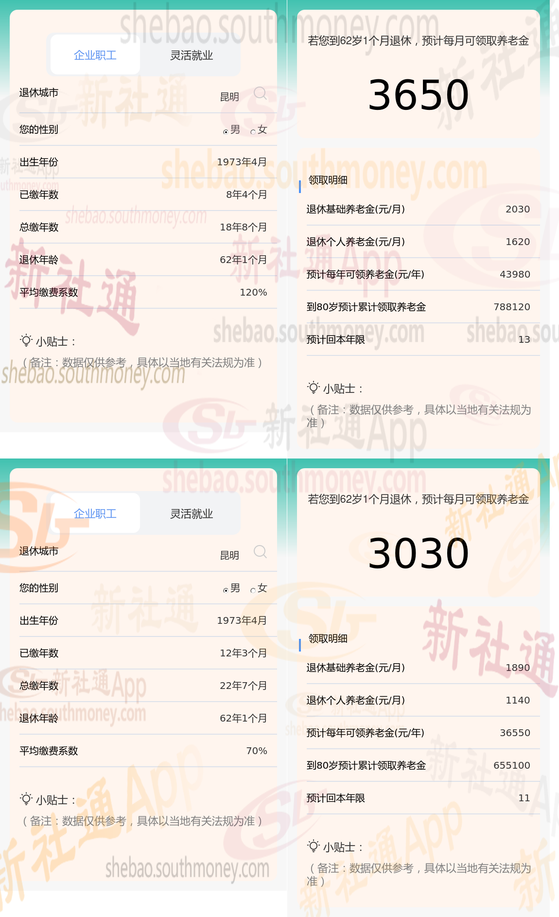 下面社保网app一起来看下,以昆明为例(不考虑过渡养老金):