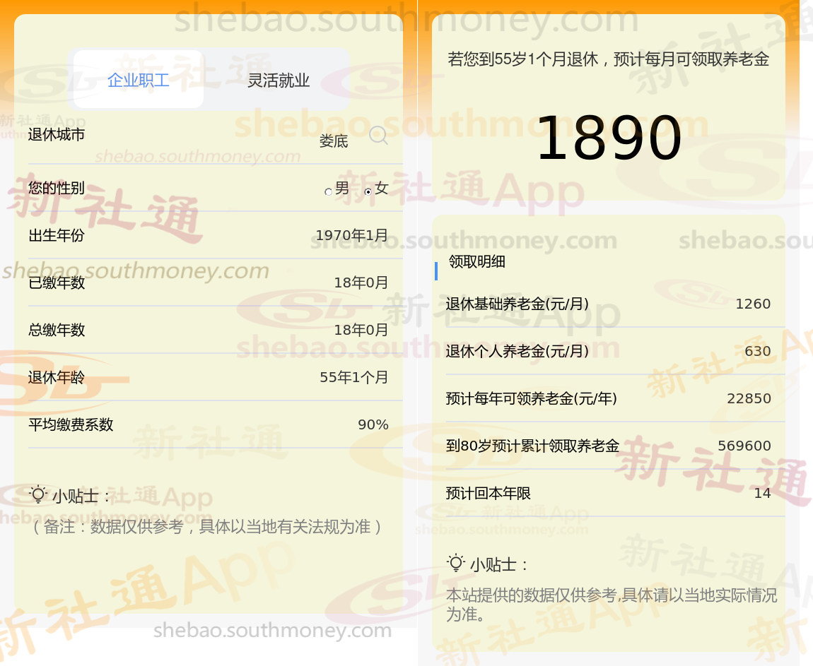 新社通app养老金计算器计算所得: