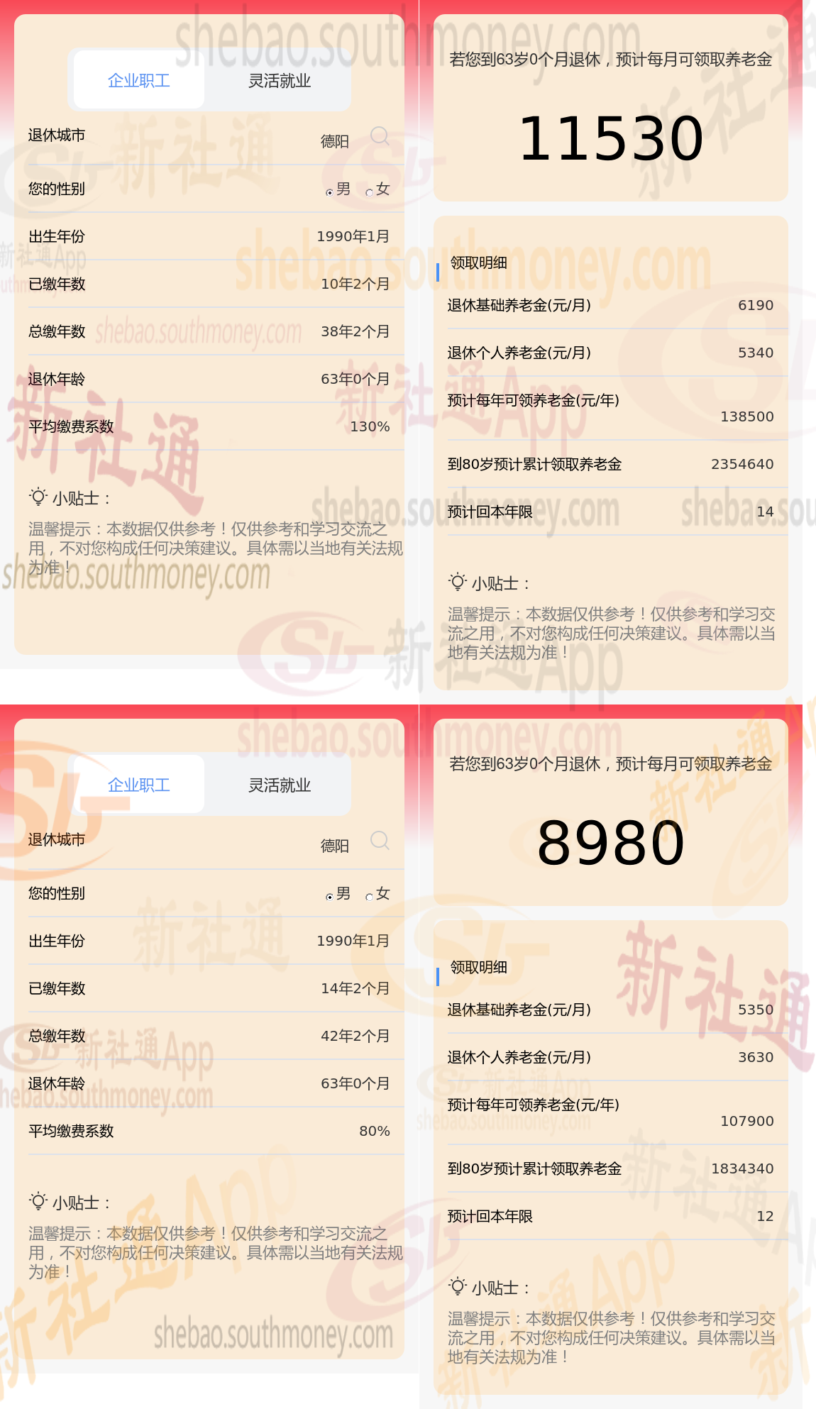 老何:退休城市德阳,缴费年限42年,退休年龄63周岁,但是按80%缴纳社保。