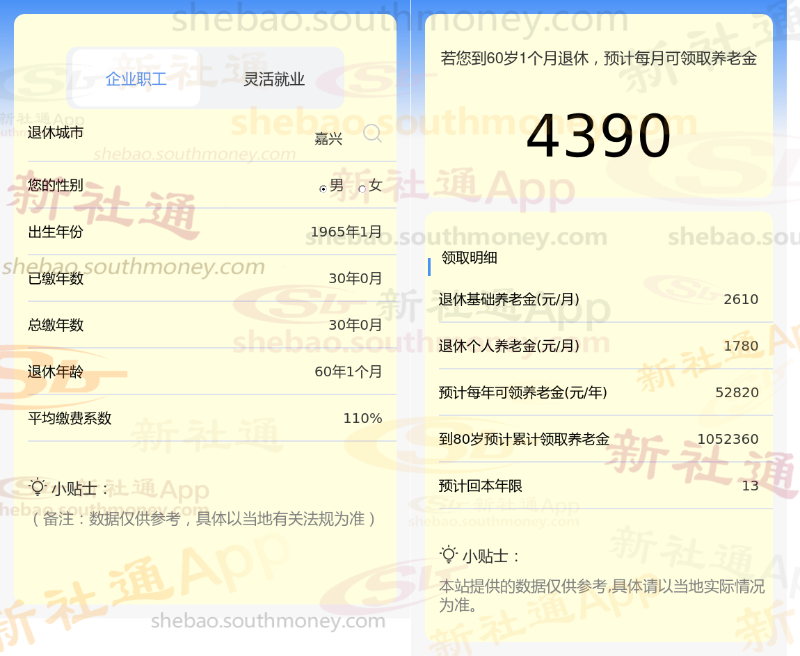 笔友朱某退休城市在嘉兴,性别:男,出生年份:1965,总缴年数30年,缴费档次:110%,新社通app养老金计算器所得: