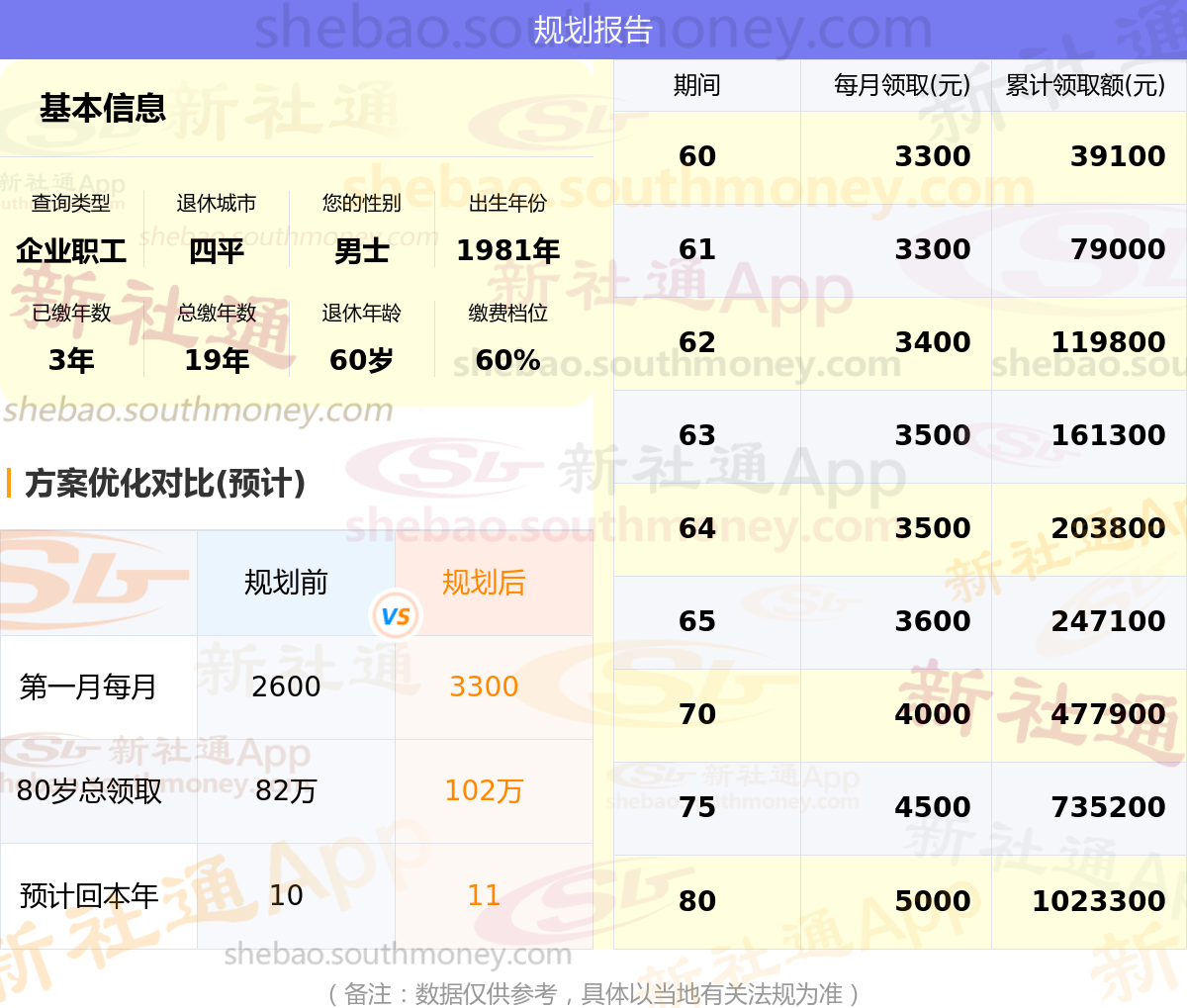 规划前:60岁第一个月养老工资约2600元,新社通APP-养老金规划后:60岁第一个月养老工资约3300元
