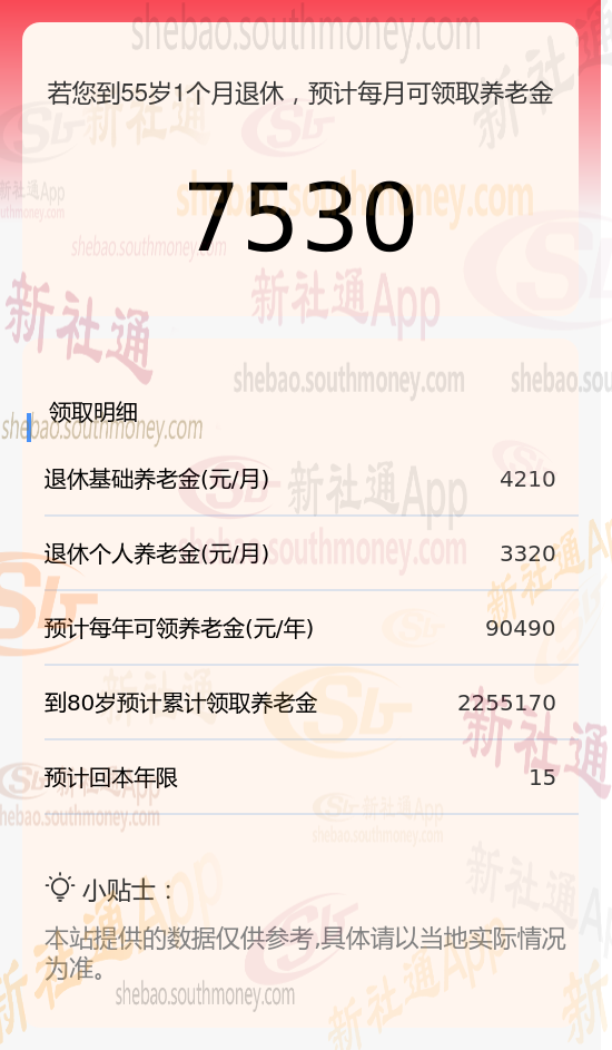 现在,我们来计算一下每月可领取的养老金总额。只需将基础养老金的4210元与个人养老金的3320元相加,得到的总数就是每月可以领取的养老金,大约是7530元。这个数字象征着您退休后每月可以期待的一笔稳定收入。