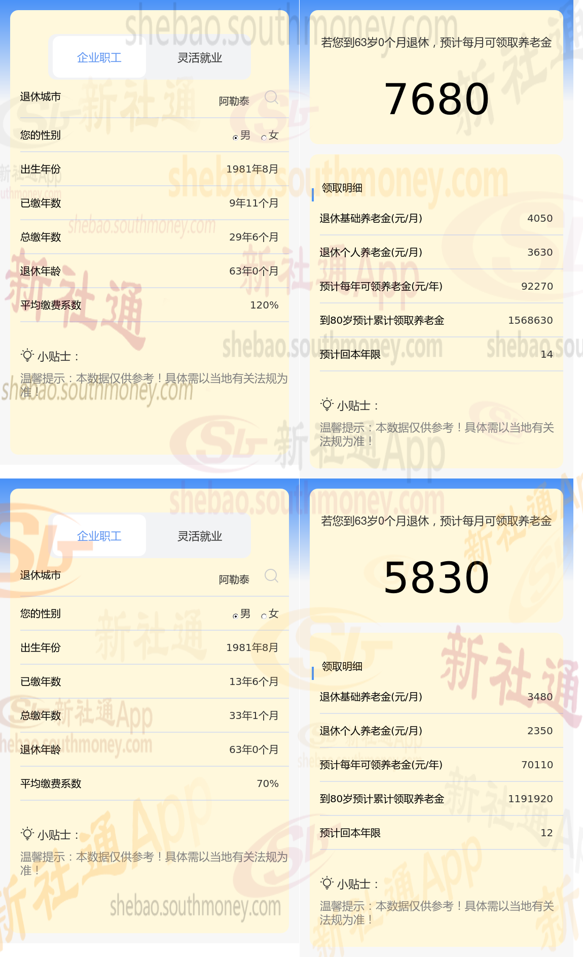 下面社保网一起来看下,以阿勒泰为例(不考虑过渡养老金):